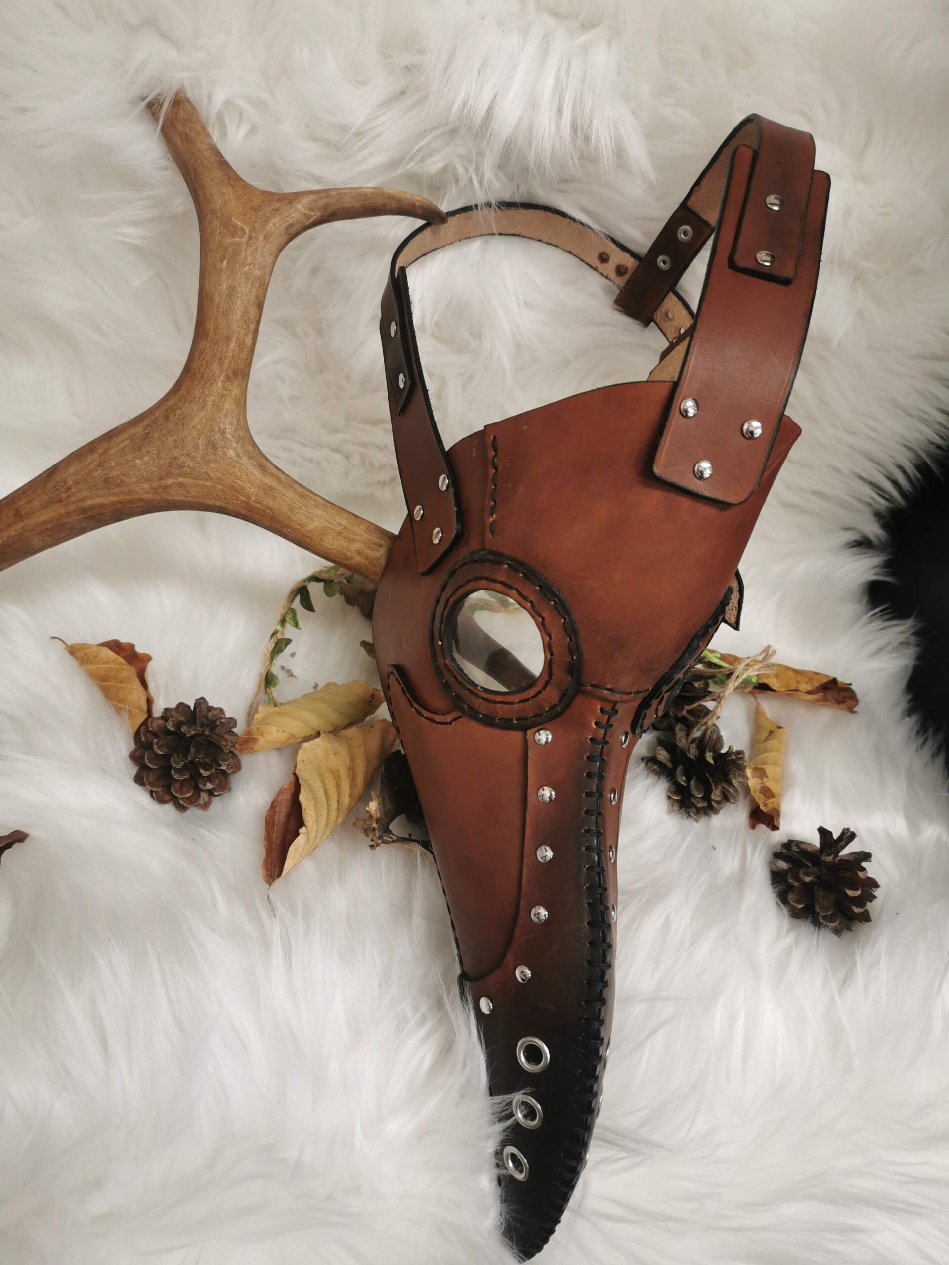 Masque de Peste en cuir de bovin à tannage végétal teint et cousu à la main.
