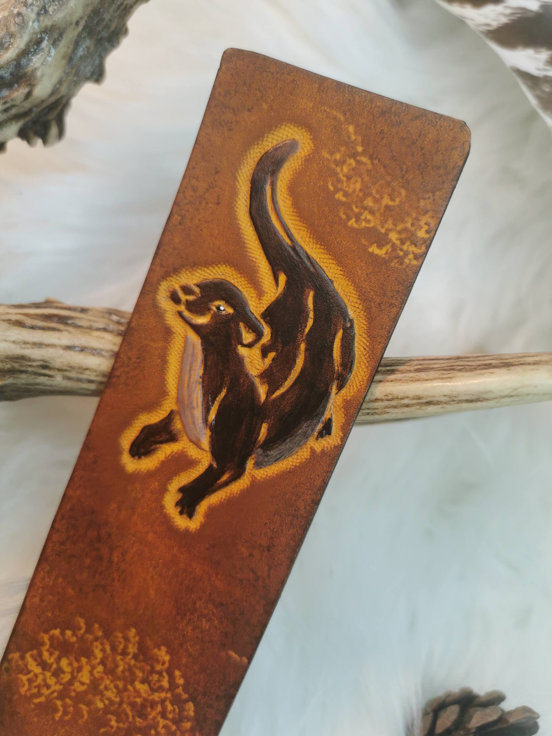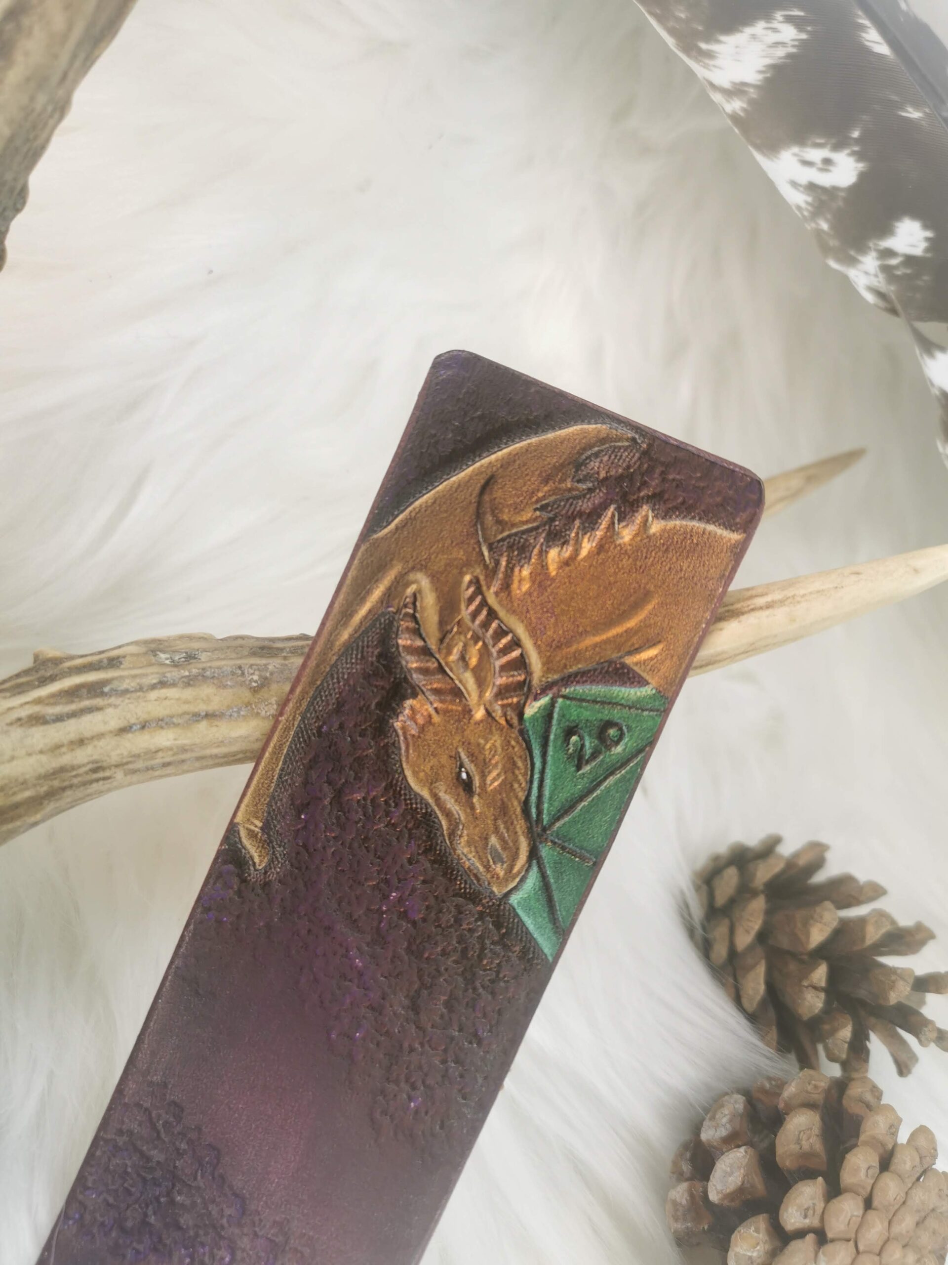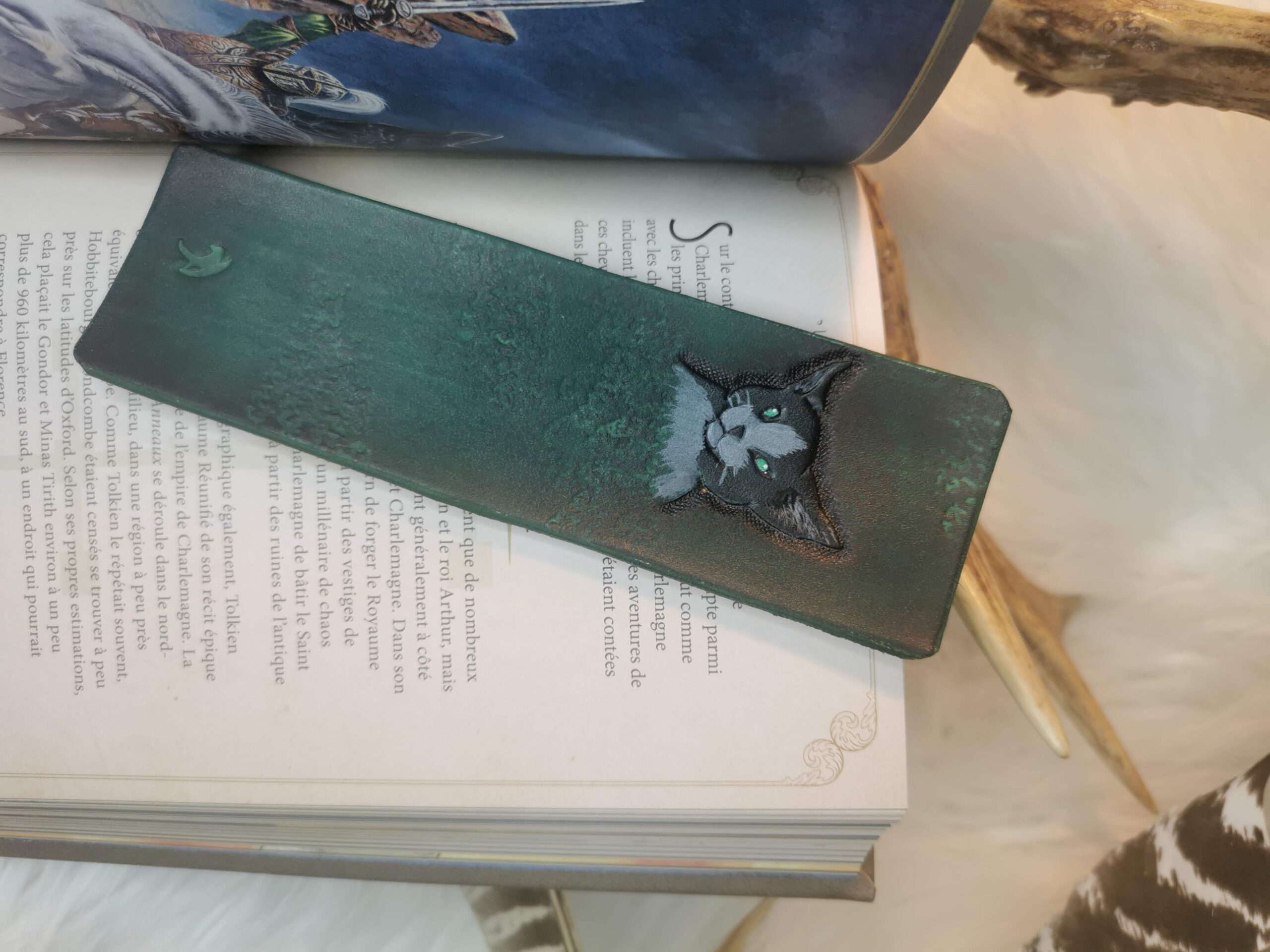 Marque-page en cuir de bovin à tannage végétal repoussé et teint à la main.