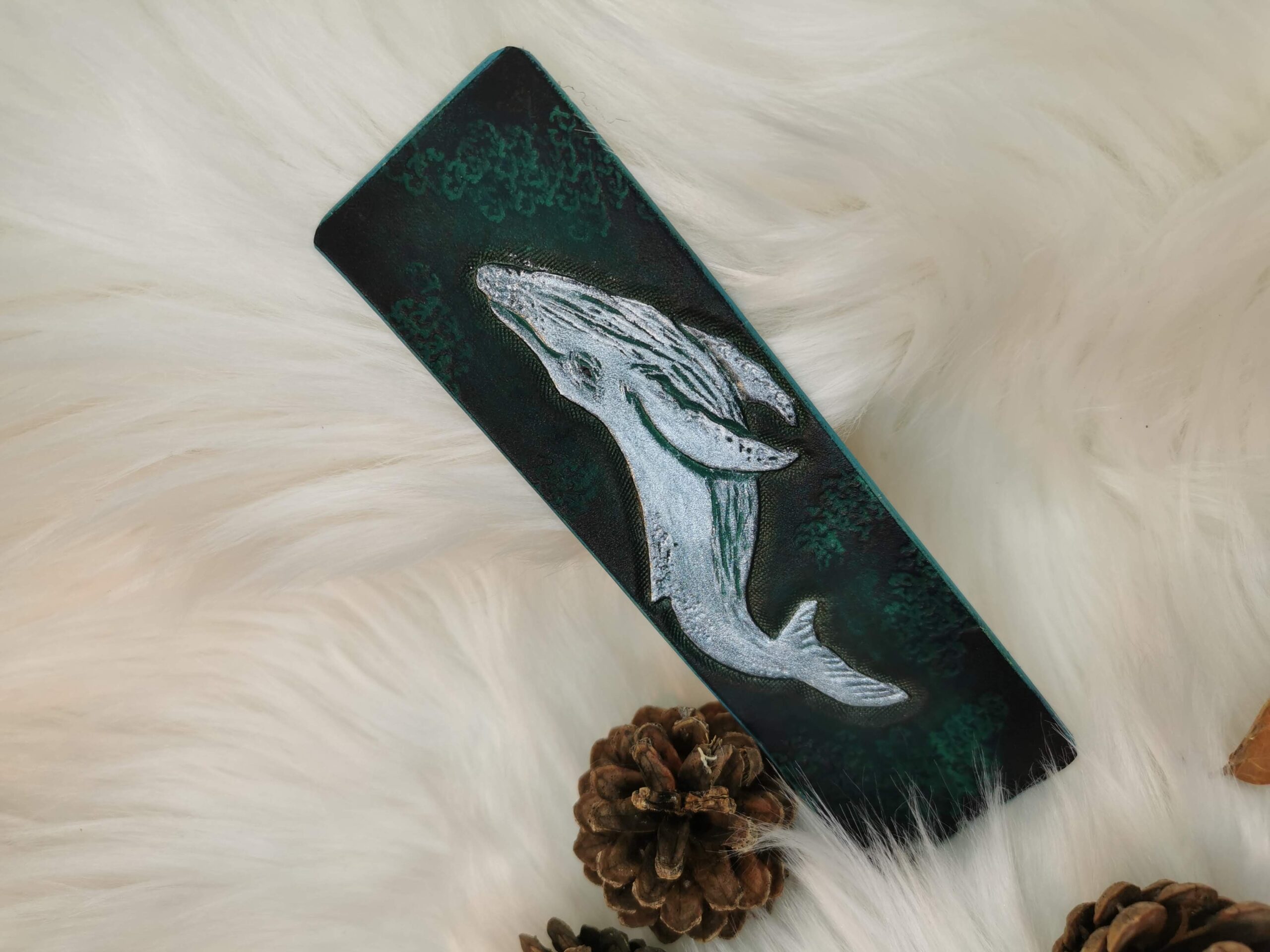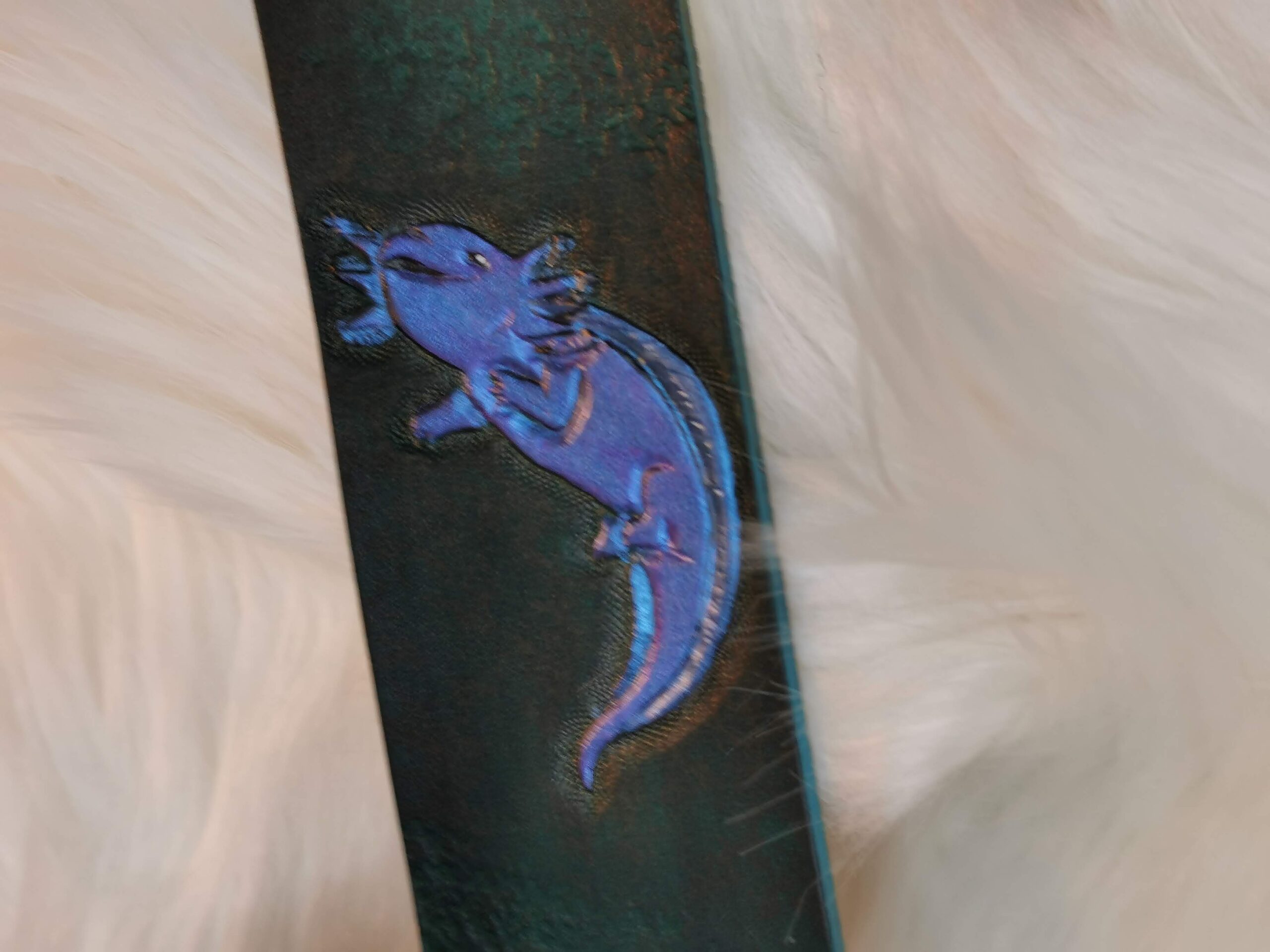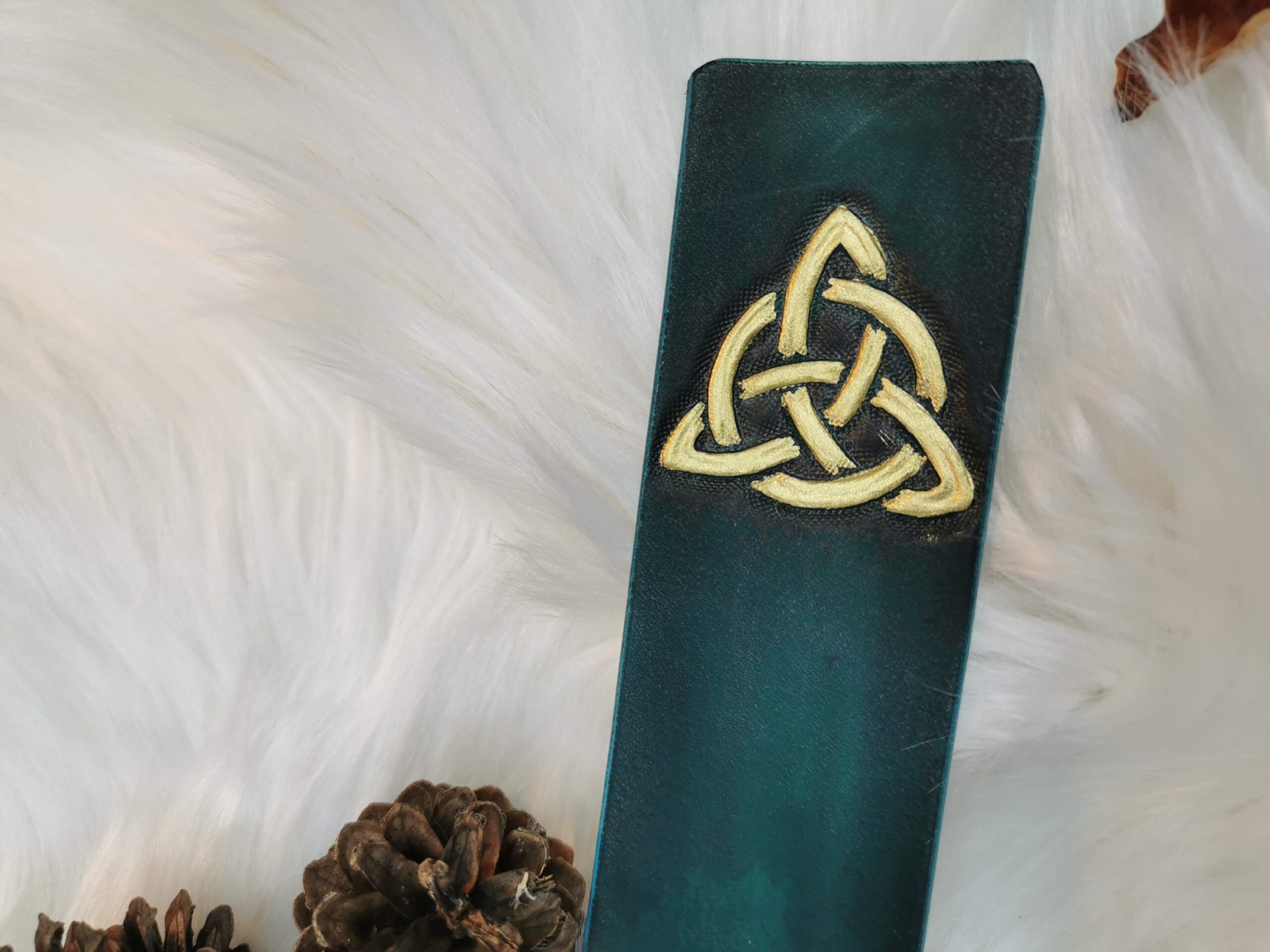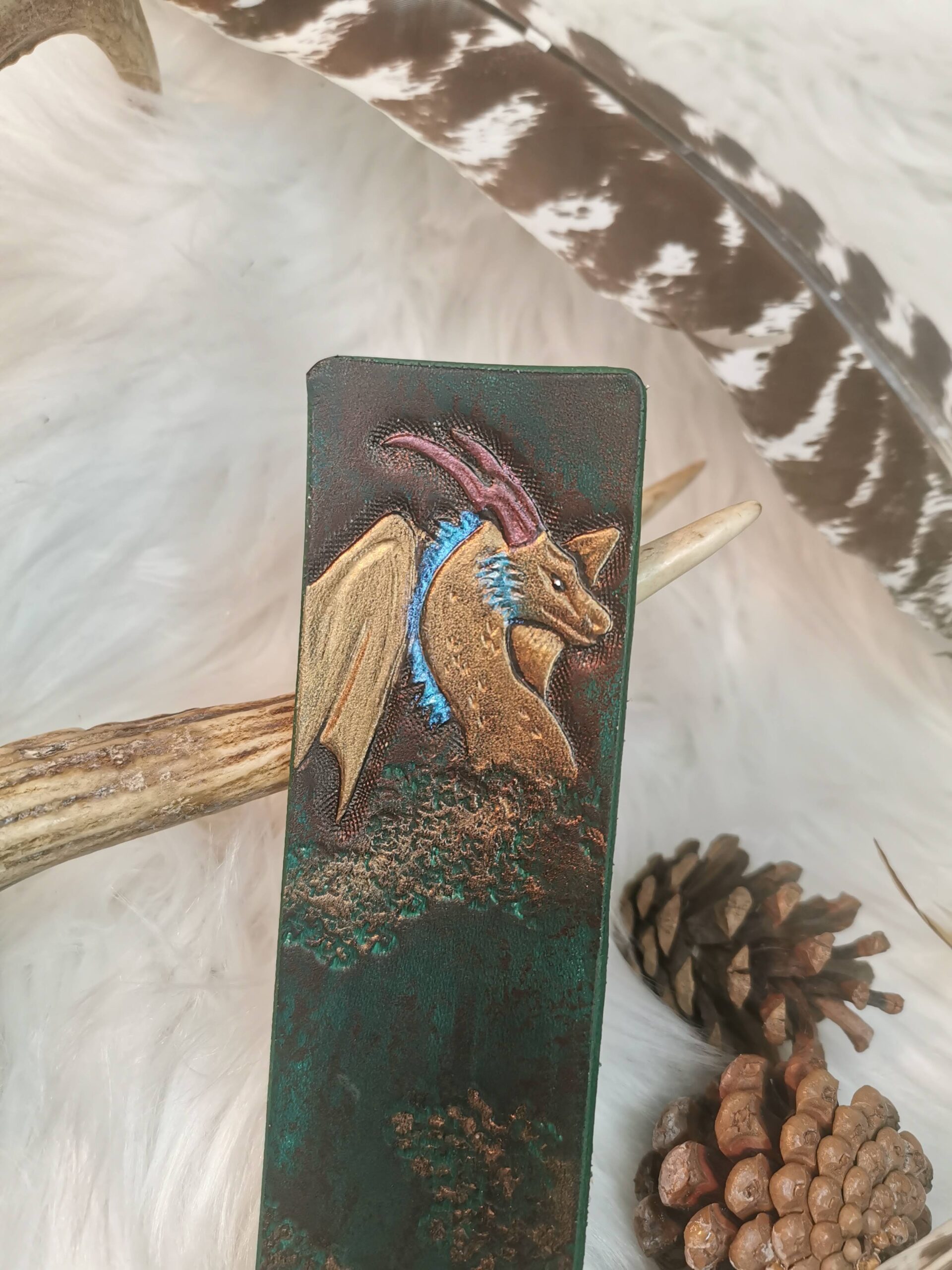 Marque-page en cuir de bovin à tannage végétal repoussé et teint à la main.