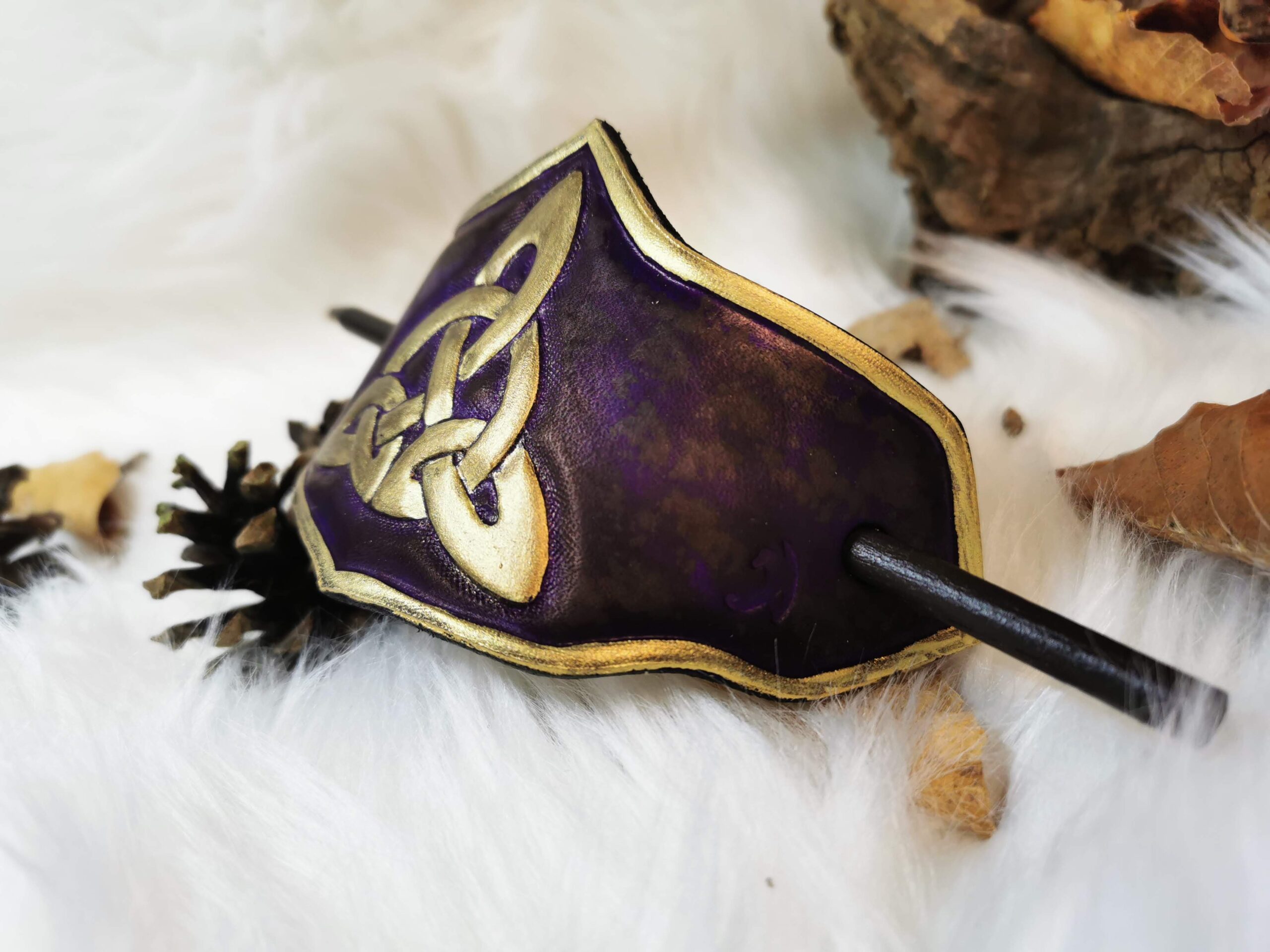 Barrette en cuir de bovin à tannage végétal orné d’un délicat entrelac doré sur fond prune.