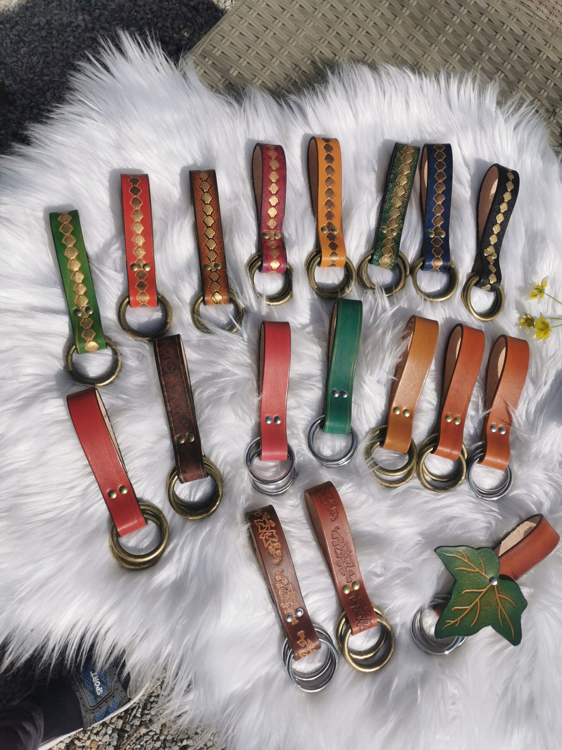 - Dimensions : 16cm du passant jusqu’au bas des anneaux, passant en cuir 25mm, anneaux 35mm diamètre intérieur.