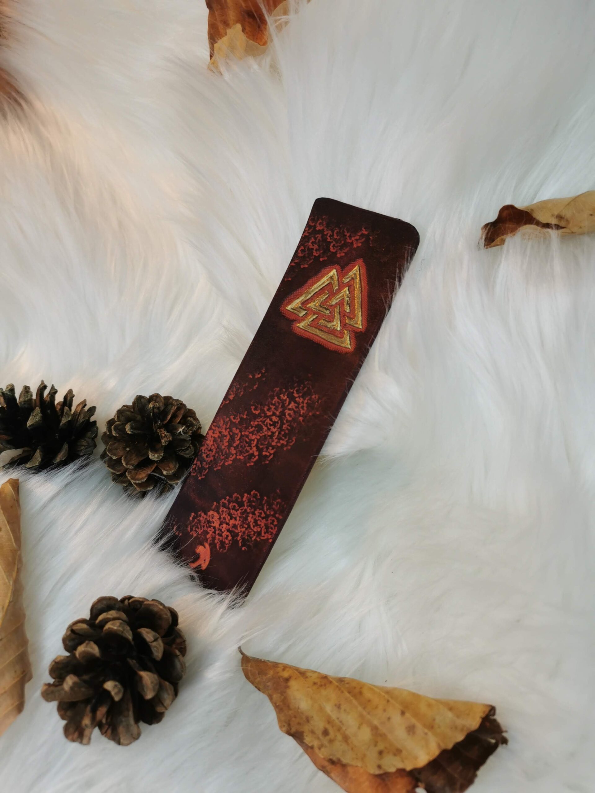 Marque-page en cuir de bovin à tannage végétal repoussé et teint à la main.