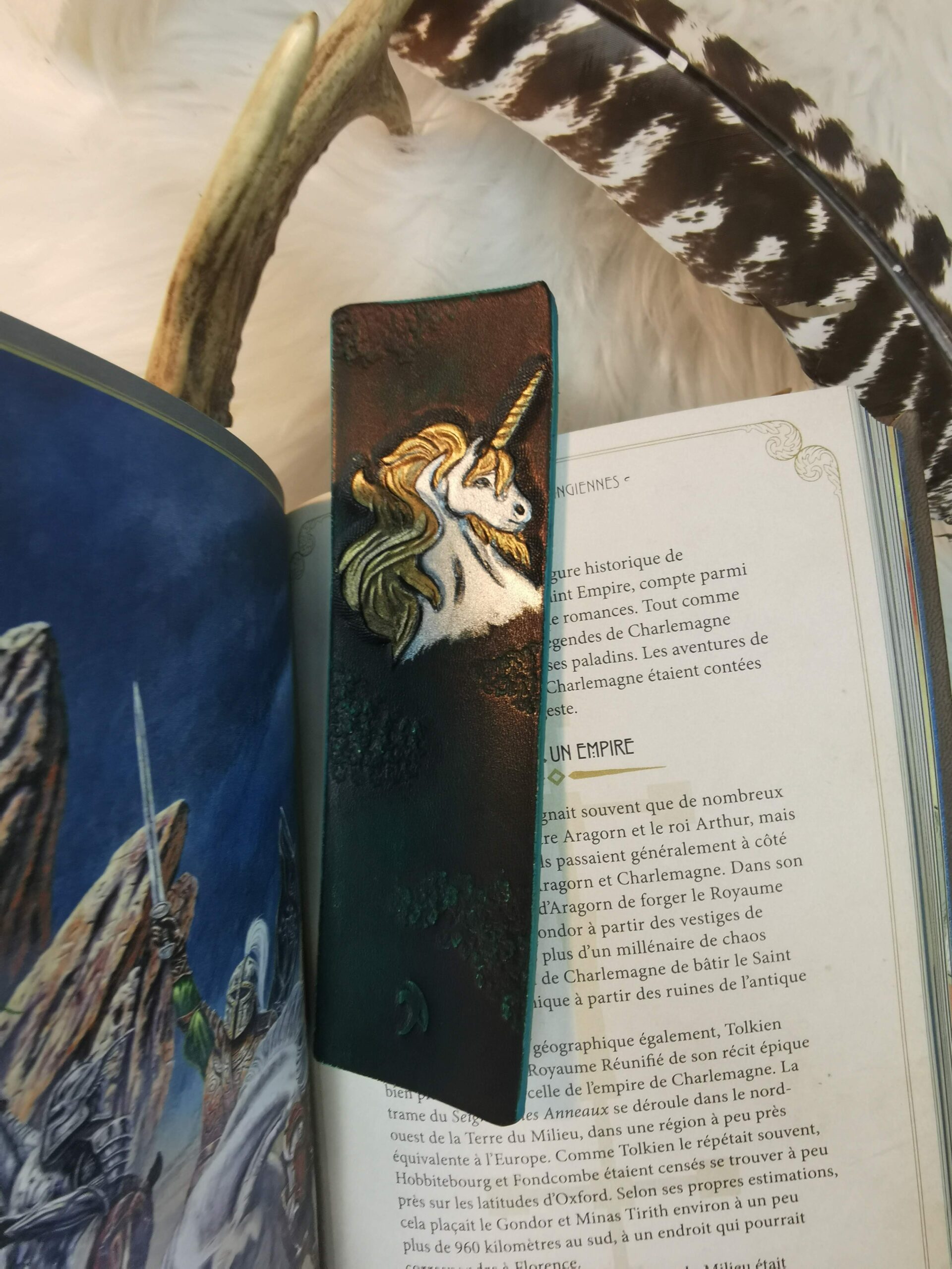 Marque-page en cuir de bovin à tannage végétal repoussé et teint à la main.